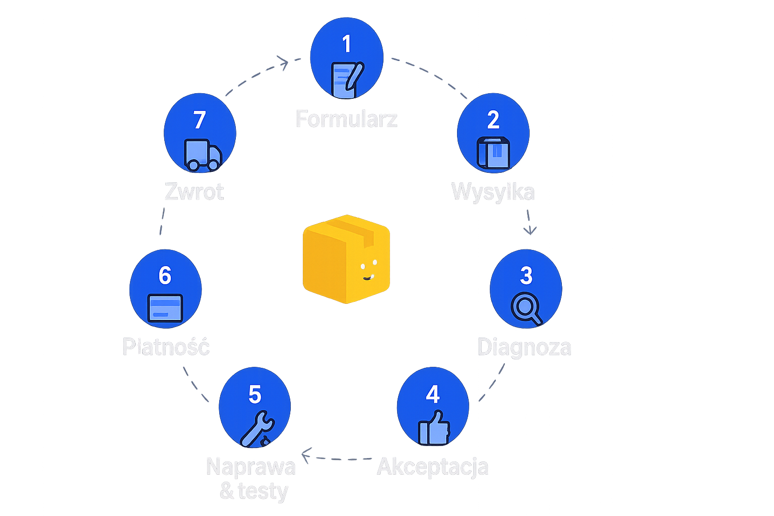 1. Formularz | Wypełniasz zgłoszenie — otrzymujesz numer sprawy i instrukcję nadania paczki. | 📃 |